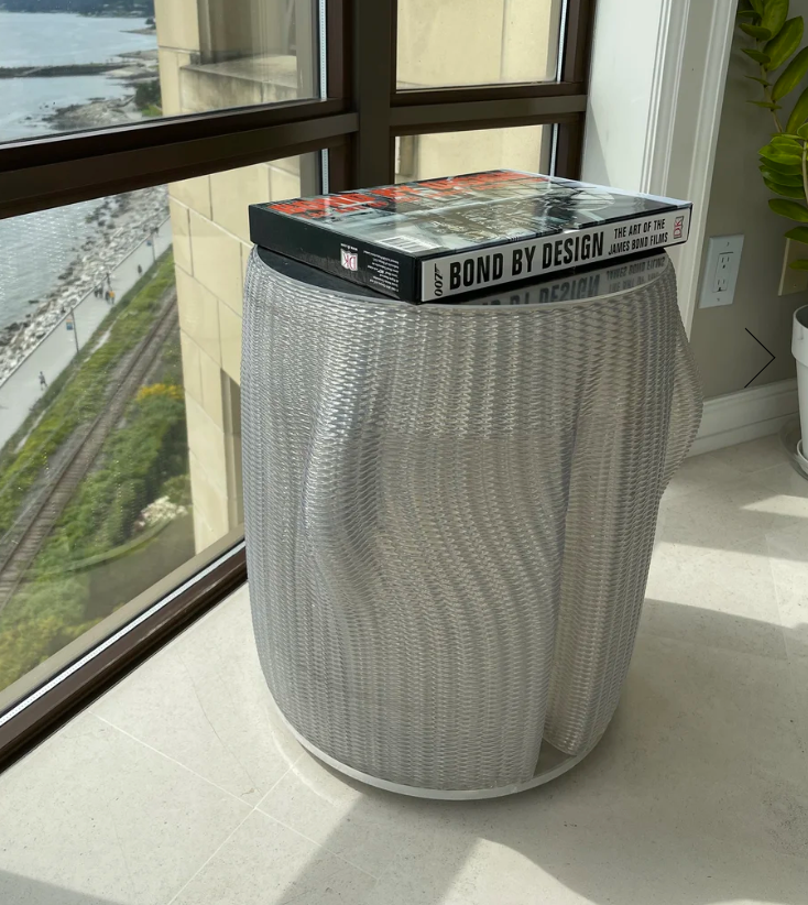The Juniper Side Table & Floor Lamp merges light, texture, and structure into one striking design piece. 3D printed in woven PETG beads with robotic precision, its layered form glows from within, casting a soft industrial warmth. Anchored by a ½” aluminum base and finished with your choice of wood or aluminum top, Juniper balances technology and craftsmanship in a sculptural side table that doubles as a lamp.