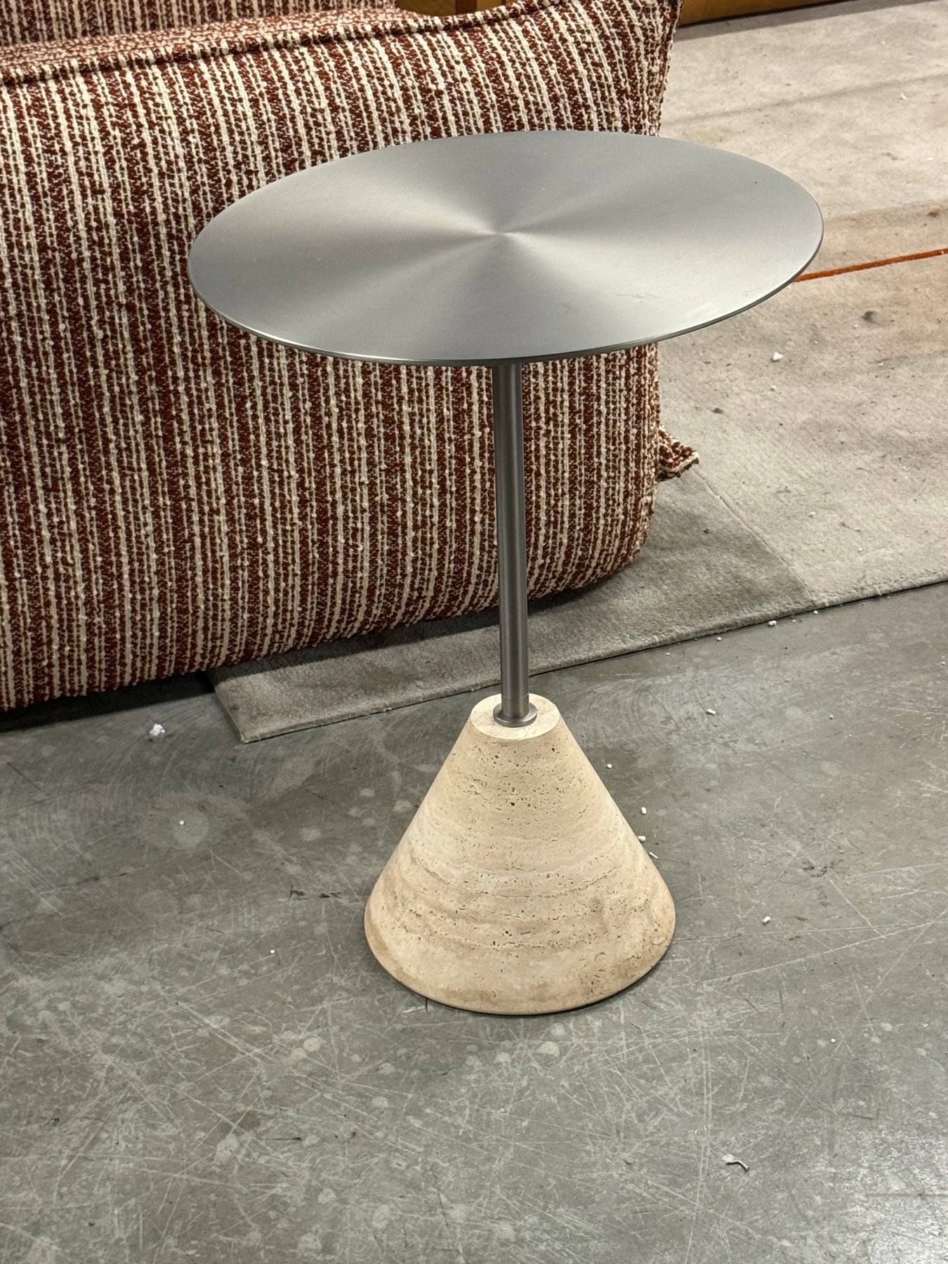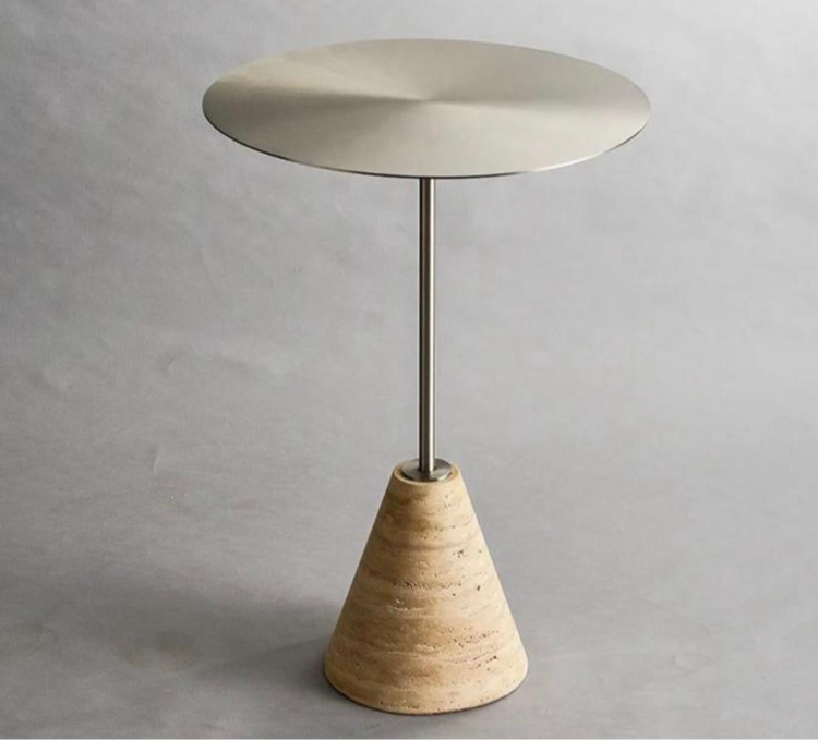 Industrial modern modern table with a natural travertine stone base and stainless steel stem with brushed stainless top table.