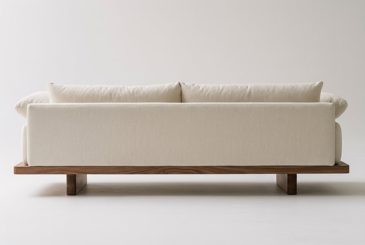 Built on a foundation of solid wood feet with a hardwood base framed in real walnut veneer, the sofa showcases natural grain and warmth, anchoring the piece with timeless materiality. The fixed side and back panels rise gently from the platform, allowing the loose, pillow-top cushions to settle against them with relaxed softness. Each cushion is generously filled, offering a plush, inviting seat that contours to the body — ideal for long conversations, slow mornings, or quiet evening unwinding.