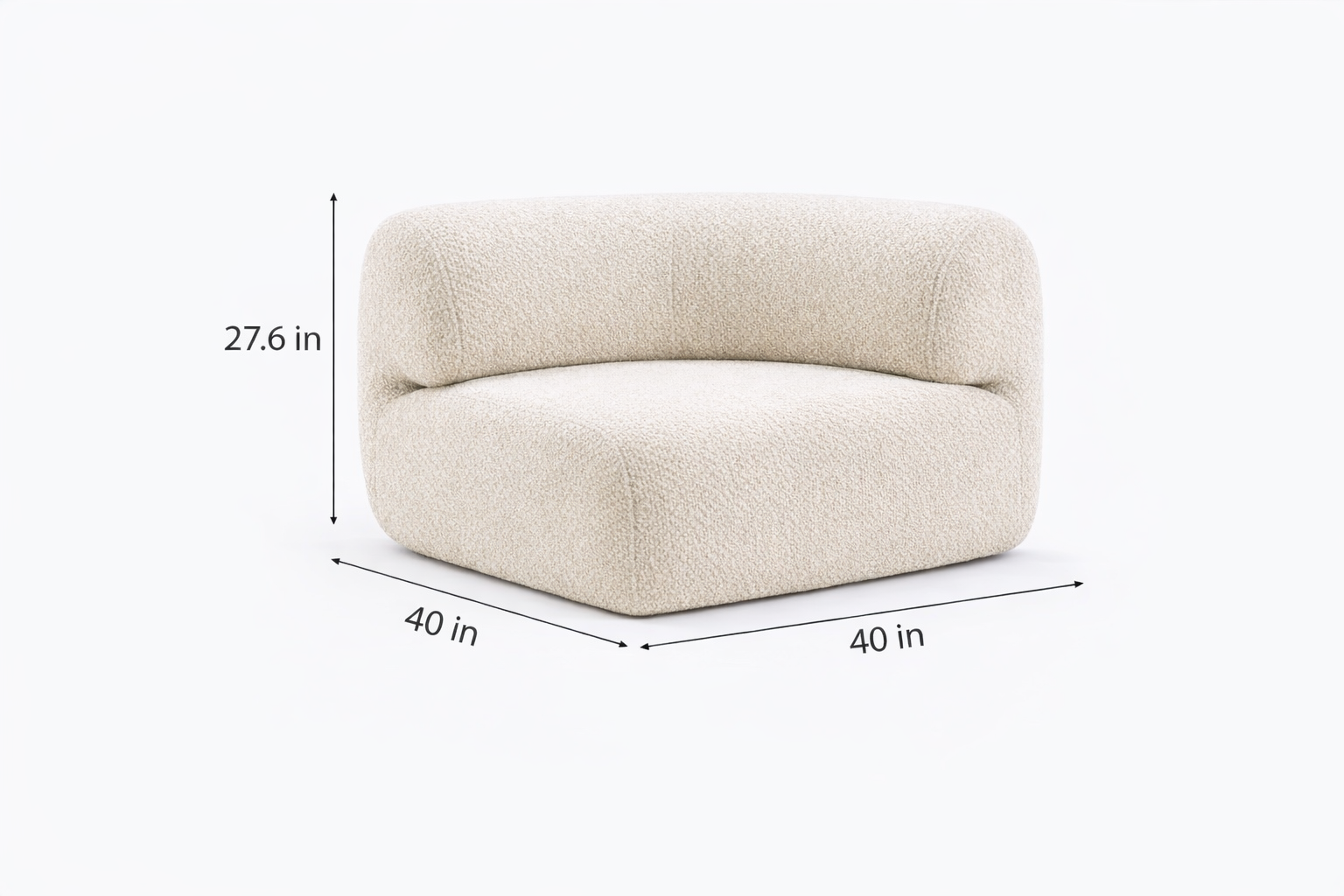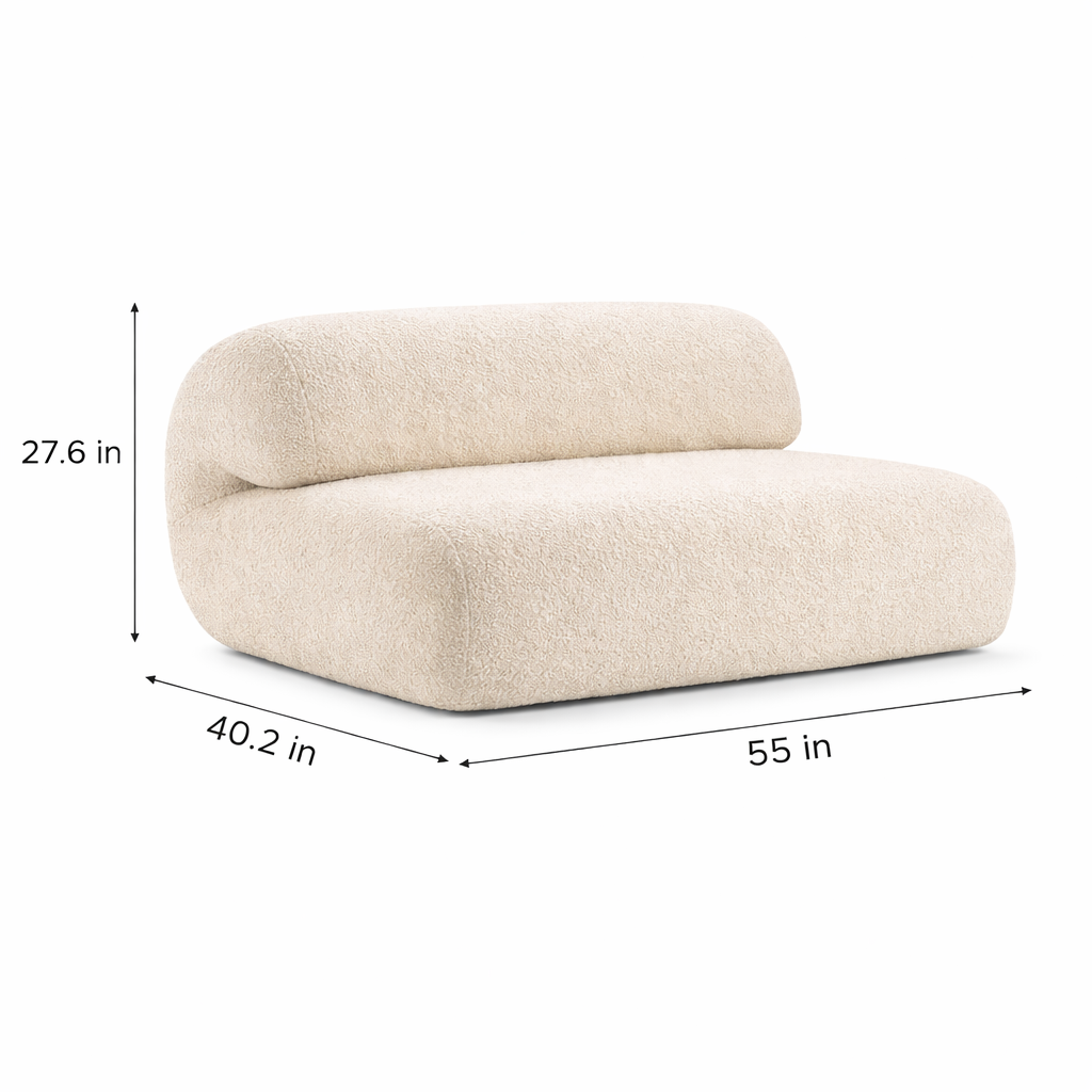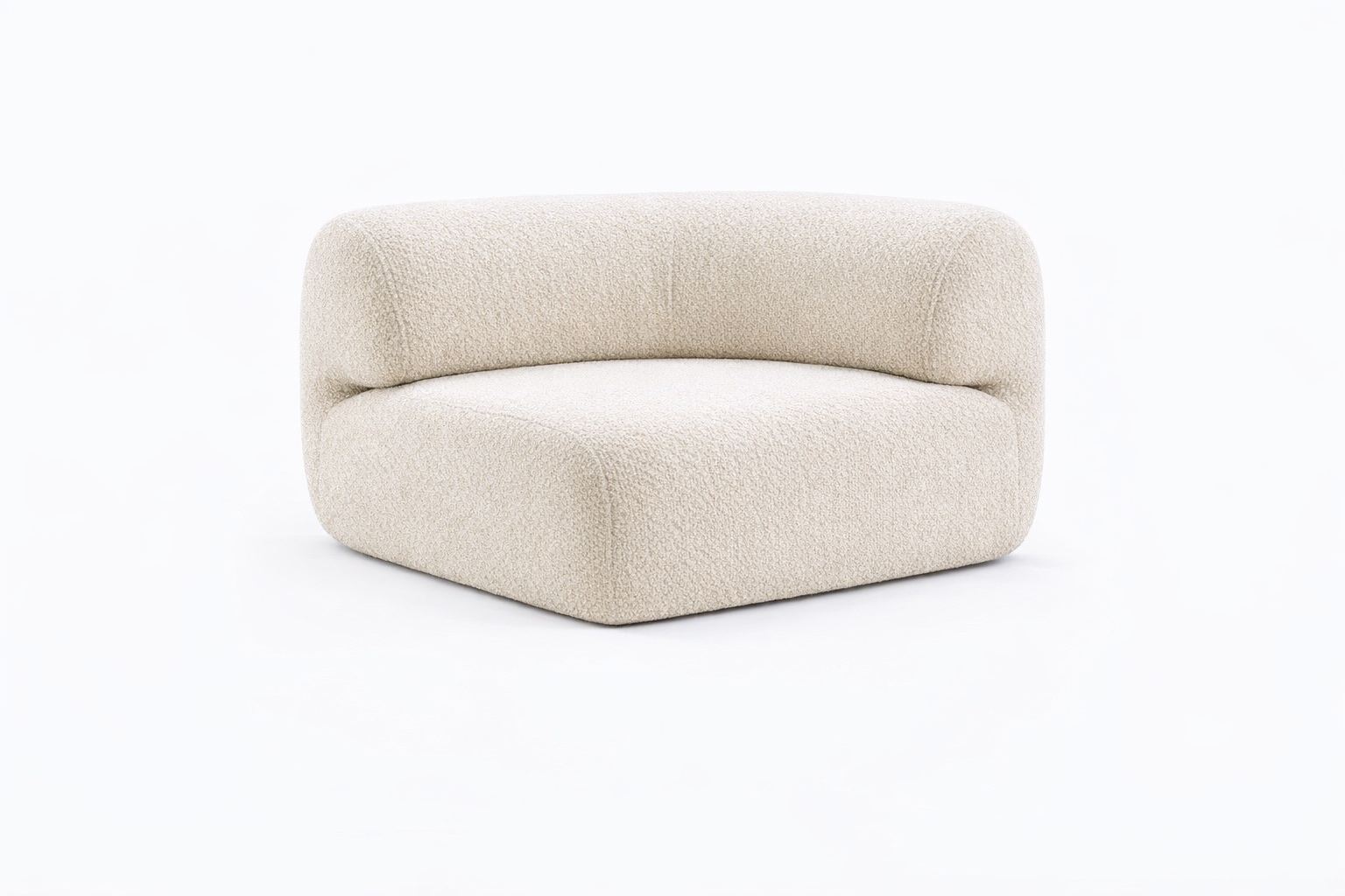 Wrapped in a richly textured cream boucle, Ondo delivers a tactile softness that complements its fluid geometry. The floor-hugging base removes visual heaviness, creating the illusion that the piece is almost floating—anchored by its mass, yet light in its expression. Whether styled in a living room, creative studio, bedroom, or open-concept space, Ondo adapts intuitively, always enhancing its surroundings without demanding attention.