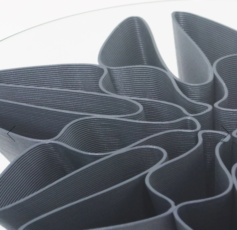 Like ripples spreading across water, the Aqua Table brings fluid energy into your space. 3D printed from recycled PETG in a cool slate-blue hue, its sculptural base blooms beneath a glass top, resembling petals or waves frozen mid-motion. Equal parts furniture and artwork, it’s built for modern living with a sustainable heart.